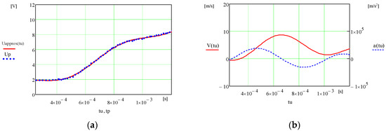 As mentioned before, a resistive Megatron linear displacement sensor was used to record the displacement at small initial capacitor energy (E < 40 J). The comparison of the waveforms obtained from the optical and potentiometric sensors yielded very good results. However, to carry out the validation of the modified sensor, it was necessary to construct a system that allow for determining at least a few measurement points of the displacement characteristic with much higher initial energy of the capacitor (e.g., 6-fold increase). For this purpose, a simple inertia-less circuit (E-R) is used, closed with a connector whose one contact is a moving disc (Figure 25 in [37]). The moment of occurrence of the current pulse in the E-R circuit determined the time after which the disc traveled the distance to the second contact. With each “shot” (initiating disc motion by providing a gate pulse of the connector closing the coil circuit), the precise measurement of the distance between the disc and the second contact was changed and determined. In this way, it was possible to determine several points of the displacement characteristic and compare it with the characteristics obtained as a result of the conversion of the waveform recorded from the optical sensor. The differences (relative error) between the displacement characteristics obtained in this case for the considered initial energy (E = 245 J) did not exceed 4%. It should be emphasized that this method can be implemented owing to very good repeatability of the obtained currents and displacements for each “shot”. Summarizing the results, it can be concluded that the modified optical sensor is suitable for recording dynamic displacements, and is additionally characterized by simplicity of construction and lower costs compared to other complex measurement systems used to record straight-line traffic. However, it should be underlined that the presented sensor records the movement of one point (in this case it is the center of the disc). Currently, ultra-fast cameras are used to record the movement of the disc, allowing for observation of the movement of the whole object, which allows for obtaining a course of displacement in time of each point marked on the disc. Currently, the latest measurement system (authors’ system) is equipped with such a camera (Figure 4). Significant results (according to the authors) obtained with the use of an ultra-fast camera recording the movement of the entire disc are presented in [40]. Measurement of the basic quantities recorded in the measurement system discussed, i.e., current using a low inductance resistive shunt and displacement via an optical sensor, can be determined as a direct measurement. Reference [36] discusses the metrological classification of the most important quantities characterizing the induction–dynamic drive into those measured directly and indirectly. The indirect measurement is understood to be a result of a measured quantity that can be obtained by way of more or less complex mathematical operations on quantities measured directly (unprocessed raw data). In the case of displacement, the values of velocity and acceleration can be obtained by double differentiation. However, when attempting to differentiate the course obtained in the form of raw data, this operation results, as could be expected, in a large distortion due to even slight disturbances in displacement characteristics.