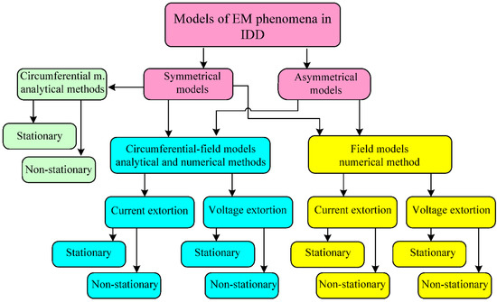 These basic models gave satisfactory results for a very small range of free frequencies of the coil supply circuit (RLC) not exceeding 1 kHz. Their only advantage was the possibility of obtaining a simple solution using the analytical method. Figure 8 presents a block diagram that is an attempt to systematize the models used so far, which analyze in the narrower or wider range the electromagnetic phenomena (EM) in induction–dynamic drives (IDD).