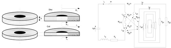 An attempt to analytically solve the problem from the circumferential-field perspective for a system with cylindrical symmetry was undertaken in [3,52]. The authors of these papers, in order to determine the equivalent inductance LE of the coil–disc system, also used the method of current filaments performing a single-layer discretization of the disc. However, in order to obtain a solution to field equations, they had to make a number of simplifying assumptions, the more important of which are: