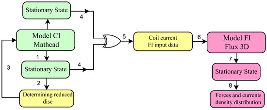 Because in the CI model the discretization did not exceed 100 filaments, the FLUX 3D environment (using FEM) was used to increase the accuracy of the current density distribution, in which the coil–disc system could only be modeled under current extortion, but the disc was divided (meshing) into 40,000 elements. As a consequence, a model was created consisting of a “combination” of CI and FI models (referred to in [63] as the CI-FI hybrid circumferential-field model). The block diagram of CI-FI coupled models is shown in Figure 10. As can be seen from this diagram, the coil current constituting current extortion for the field model is calculated on the basis of the CI model at the predetermined reduced disc. This current can be calculated for both stationary and non-stationary cases. Next, in the FI model, the current density distribution for the real (unreduced) disc is determined, and hence the resultant axial force as a function of time, also for a stationary case. On the basis of this force, displacement was determined for the real disc, still considered here as a moving element with non-vibrating translatory motion.