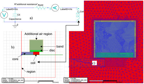 Maxwell’s electromagnetic model is based on the solution of the general equation determining the vector magnetic potential (19). The velocity of the moving medium (disc) is determined on the basis of the equation of motion under the influence of electrodynamic force determined on the basis of the general formula (20), (in the CI circumpherential model, Formula (21) was used to determine the electrodynamic force). In addition, the model should be formulated with the coil power supply circuit from the capacitor battery, thus realizing the voltage extortion (Figure 11a). The model validation was carried out by comparing the results of the simulation with the results of the CI model for a non-stationary case, which in turn was verified experimentally for IDD parameters, defined as low energy in [40].
