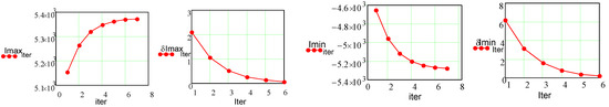 Convergence of the maximum and minimum values of the coil current and relative error.