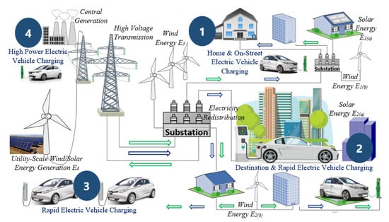 While an EV could be charged through one of the electricity tariffs (like the time-of-use tariff) that could be available within customer premises (residents, business sites, and industrial destinations—around points 1 and 2), it could also be charged around destinations and through points of higher power supply: at points 2, 3, and 4—Figure 1. Because a typical vehicle is parked most of the time, the EV could be charged through any lower price electricity available through longer durations within the built environments or through incentivised public EV charging infrastructure or through any other arrangements supporting low-emission transportation.