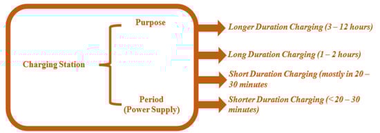 In other words, as depicted in Figure 2, the purpose and the power supply available for charging indicate reasonable durations of charging and will further suggest possible locations where different EV charging needs could be met; for example, long duration charging is applicable for home EV charging (charger could be powered with the home electricity using off-peak tariffs during the day or overnight) while faster charging is more desirable in public or enterprise EV charging where users will typically demand vehicular charging in transit—the charging will be required within shorter periods (few minutes)—and is feasible at the locations where higher voltage electricity and EV charging equipment could be installed.