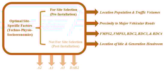 Categorised under Table 2, the other techno-physio-socio-economic and site-specific optimality factors for a rapid EV charging station include: Hardware Access to the Disabled (A2), Signals & Signposts (A3), Charging Point Availability (A5), Generation Headroom (EAH4), Data Access for Leisure (DAB2), Open Space Free from Obstruction (FMPS2), Feasible Installation of Protective Shield (FMPS3), Location within Interest Range (RDC2), Strategic for Border Travel (RDC3), Non-Existing Charging Point (RDC4). As depicted in Figure 4, some of the factors are required to determine optimality pre-installation of the EV charging station—during site selection. Others are required as additional mechanisms to enhance the accessibility, operation, or utility of EV charging stations and their locations.
