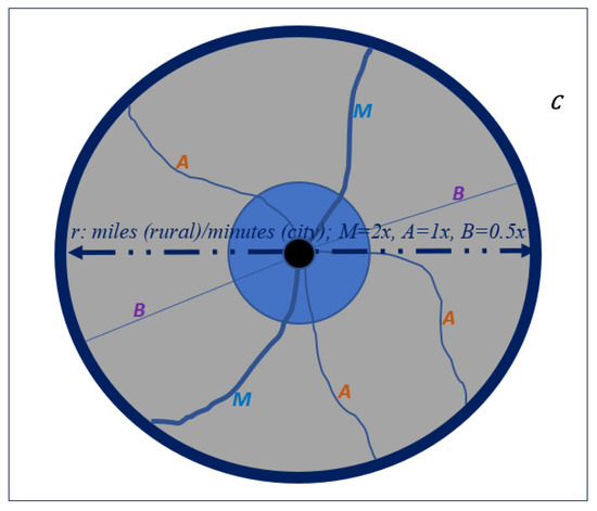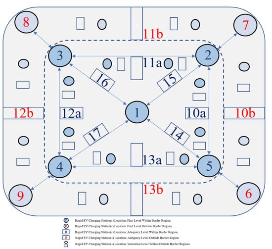 Taking the average EV battery capacity to be 50 kWh and taking 0.5 kWh as the average energy per mile used by an EV, a first-level (representing a minimum standard) rapid EV charging station will be located at every 100 miles of vehicular travel distance, Figure 5 (around locations 1, 2, 3, 4, 5, …, 9)—covering all the travel distances within and across border regions: this represents a minimum standard because a typical EV will need to be charged at each of the charging stations located across a travel path to continue to travel. Additionally, if any of the EV charging stations (at the travel paths through locations 1, 2, 3, 4, 5, …, 9) is not available for any reason or if the user forgets to pull over to charge at any of the locations, the EV will run out of energy and the user could be stranded.