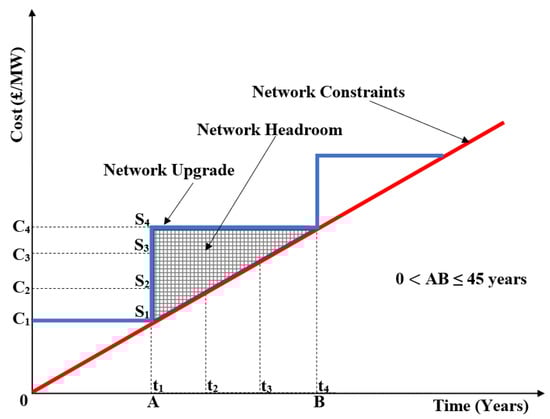 In analysing the benefit of the incremental network upgrade solution with conventional network upgrade solution, the lifespan of the charging station and any energy storage device must be considered with respect to the conventional network upgrade solution (typically lasting for up to 40 years). A cost–benefit analysis of alternative solutions (cost–benefits C1 to C2 compared with alternative cost–benefits S1 to S2) should identify the best alternative within the planning period, Figure 7. The best upgrade solution will optimise existing network infrastructure, avoid redundancy of infrastructural investments, reduce electricity cost burden to the general body of consumers, and promote the use of any available renewable energy resources.