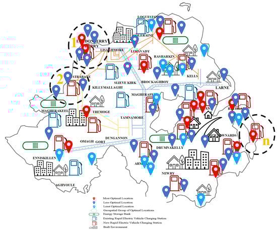 The next stages define the classification of the optimal EV charging stations with respect to their level of optimality. Additionally, geospatial groups are defined using an illustrative NI border region. The selected locations within each geospatial area are checked with respect to site-specific details to ensure that the sites are fit to receive and allow the operation of the proposed EV charging station, and possible replacements are made where necessary.