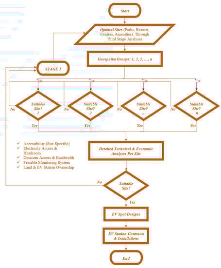 The methodology presented in this work includes a multi-criteria technique applied in different stages of selecting sites for rapid EV charging stations with defined purposes and specified objectives. Multi-criteria decision-making processes have been used in optimal selection in different applications. In [33], a Geographical Information Systems and Analytical Hierarchy Process (GIS-AHP) based technique has been used in determining suitable sites for solar PV power plants. In [34], from sustainability perspective, a fuzzy TOPSIS (Technique for Order of Preference by Similarity to Ideal Solution) based approach was used in selecting optimal sites for EV charging station. A GIS-based fuzzy AHP-TOPSIS combination has been described in a multi-criteria decision of optimally selecting EV charging stations [29].