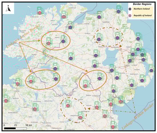 Using travel range within NI and travel across border between NI and the ROI as example: Table 4 depicts the level of rapid EV charging stations that could be deployed between the different locations to attain certain coverage distance between the publicly accessible EV charging stations. Between 2017 and 2019, 71% of all journeys within NI was by car and 5% was by bus. The average journey distance within the same period was only 6.8 miles [59]. Using the Pool Box as a tool to mark locations, with ten optimal locations selected within NI and across the border, the average distance between most of the sites is less than 60 miles, whereas to meet the EV charging station distance standard of having an EV station within every 25 miles (for reasons discussed under Section 4.2.1), a number of additional EV charging stations will be required at suitable locations between most of the contiguous EV charging stations, Table 4.