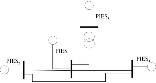 In this paper, four different IES structures for parks are constructed for resource and energy use differences, where PIES1 is an IES of electricity, cooling, heat, and gas for parks with abundant wind and solar resources, PIES2 and PIES3 are integrated energy systems for parks with a single type of wind or solar energy, and PIES4 is an IES for parks with complementary wind and solar energy. However, wind and solar energy resources are scarce compared with PIES1, and the internal resources are inadequate to meet the load demand. The structural configuration of each PIES, renewable energy output, and various load demand curves are shown in Figure A1 and Figure A2, in Appendix A. The proposed complementary topology of the RIESG is shown in Figure 4, and its line parameters refer to the standard data of IEEE 4 nodes system.