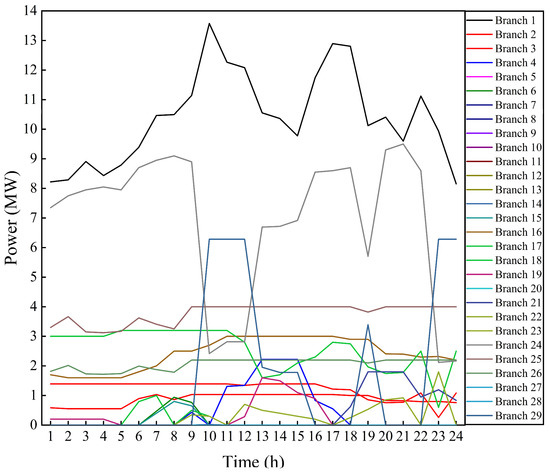 In node 3, the heat input port is branch 5, the heat output port is branch 7, and the dummy variable is . Therefore, the whole number of EH branches is 8, and the EH branch column variable is written after increasing and expanding as follows: