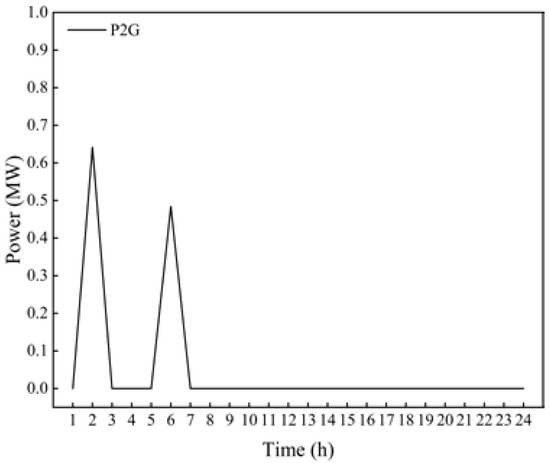 Since PIES2 and PIES3 have no unconsumed renewable energy in the park, no additional electricity to gas equipment is installed. PIES4 has unconsumed renewable energy, but the unconsumed amount is small. Therefore, 1 MW of electricity to gas equipment is added, and the P2G equipment works as shown in Figure 8. The equipment only works at 2:00 and 6:00, which is a very low utilization rate for the P2G equipment.
