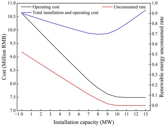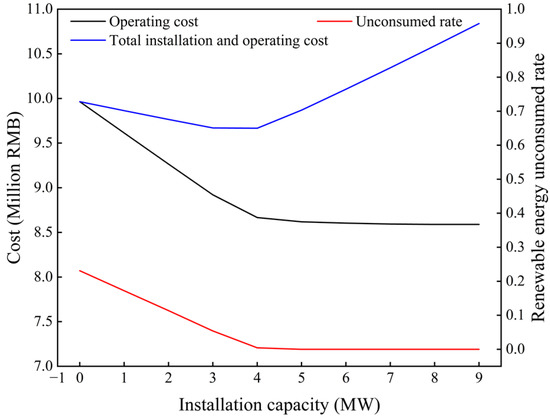 The operating cost of PIES1, the total cost of installation and operation, and the renewable energy consumption of the system by installing different capacities of P2G equipment are shown in Figure 9. As can be seen, PIES1 has a large amount of surplus power, which requires installing additional larger capacity P2G equipment for renewable energy consumption.