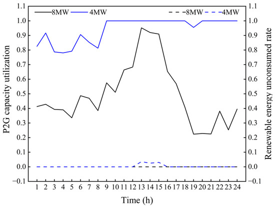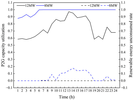 According to the operation results in Figure 10, a 12 MW P2G equipment can fully consume the renewable energy of PIES1, but the utilization rate of the equipment only reaches 80% or more at time 10:00–18:00. The utilization rate of P2G equipment is above 90% when the capacity of P2G equipment is set to 8 MW, and the equipment operates at full load most of the time. However, it cannot fully consume renewable energy, and the unconsumed rate of renewable energy for the entire day is 5.95%, and the highest unconsumed rate reaches 17.57% at 14:00.