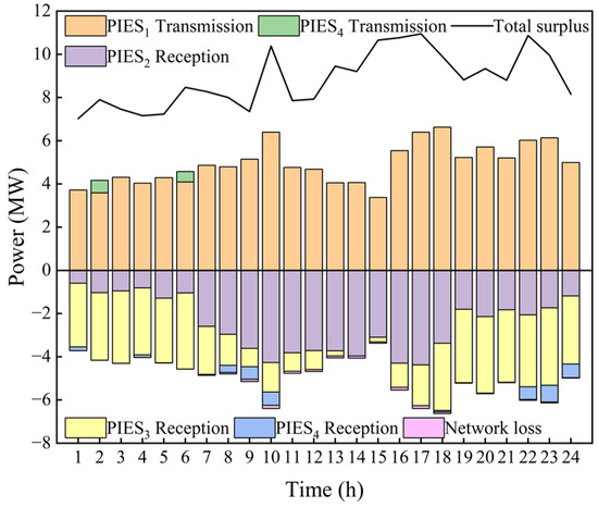 Each PIES under the scenario 1 setting operates independently to optimize its economy to meet the demand of various types of loads, and obtains the surplus power of each park, and the need for the external grid to provide power to cover the shortage, as shown in Figure 7.