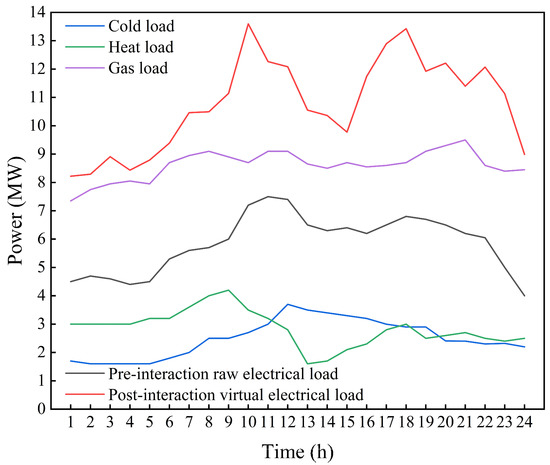 According to scenario 3, the inter-network electric energy interaction is carried out for the four PIESs, with the lowest network loss as the target function to realize the RIESG energy mutual aid, without requiring an external power grid for power shortage replenishment. Figure 11 illustrates the electric energy transmission and reception of each park, and the load demand diagram of PIES1 before and after an interaction is shown in Figure 12.