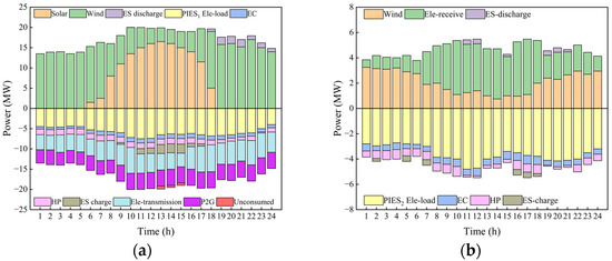 As can be seen in Figure 7, PIES1 has a large surplus of renewable energy to meet its own load demand, due to the abundant wind and solar resources inside the park. It is worth noting that the surplus renewable energy cannot be consumed under the independent operation mode. PIES2 is a single wind power generation system, and PIES3 is a single photovoltaic power generation system. Since the renewable energy resources in the park are inadequate to supply the energy demand of the system itself, the situation reflects the time difference of scenery resources, in which PIES2 is a wind power generation system, and the power shortage is larger in the daytime when the wind power generation is small, and PIES3 is a photovoltaic power generation system, and the power shortage is larger at night. PIES4 is a combination of wind and solar power generation systems. As the shortage of renewable energy resources in the park is still available, a small amount of external grid is required to cover up the shortage several times, and occasionally a small amount of surplus is not utilized. The results of the independent operation of the four PIESs reflect the resource and demand differences between the parks, and the region has the feasibility of inter-park energy mutual aid to achieve the complementarity of a RIESG.