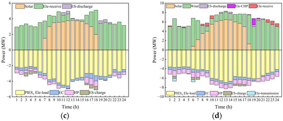 Renewable energy output and various load demand curves of each PIES: (a) PIES1 renewable energy output and various load demand curves; (b) PIES2 renewable energy output and various load demand curves; (c) PIES3 renewable energy output and various load demand curves; (d) PIES4 renewable energy output and various load demand curves.