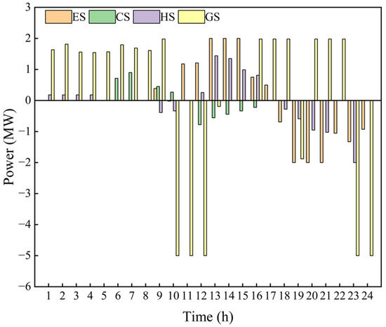 In Figure 15, Figure 16 and Figure 17, part of the surplus renewable energy of PIES1 is used to make up the electric difference to other power shortage type parks, through the electric energy interaction of the parks within the region. Moreover, the other part is electrically coupled through the electric to gas equipment to meet part of the gas load demand. The optimal scheduling of RIESG can complement the advantages and disadvantages of each park within the region and fully use each park’s internal energy storage elements to maximize the economy of the RIESG. The total cost of each RIESG category consisting of four parks under each scenario is shown in Table 2.