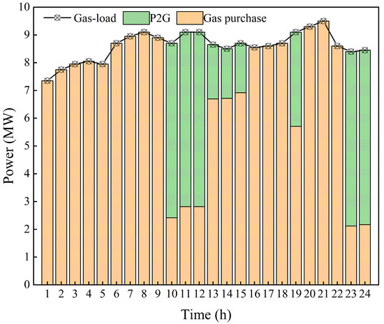 It can be seen from Figure 9 that the larger the installed P2G capacity, the lower the unconsumed rate and the lower the operating cost, and the operating cost no longer decreases when the capacity reaches 12 MW. However, when the P2G capacity is greater than 8 MW, the equipment installation cost is greater than the economic benefit of the equipment to the system operation. Hence, the total system installation and operation cost increases. The equipment capacity with the lowest operating cost and total installation and operation cost is selected for further analysis. The equipment utilization and system consumption are shown in Figure 10.
