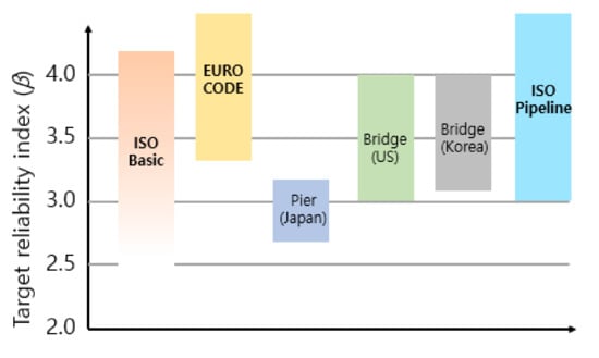 The target reliability indices used by researchers are different and should be determined before performing structural reliability analysis. Such decisions will be based on the consequences of the failure, reference rules, inspection, and repair processes, etc. Ideally, the target reliability level so selected should minimize the total cost (i.e., optimize the cost of strengthening or replacement), but still comply with a certain minimum safety level. The target reliability indices corresponding to several reference rules were illustrated in Figure 2. Accordingly, the target reliability index applied in the design standards varies from 2.0 to 4.7, and is applied to general structures such as bridges, pipelines, seaport facilities, skyscrapers, etc. ISO [] and Eurocode [] standards recommend target reliability indices in the range of 3~4.7 for general structures. In the case of bridges, the damage to human life and property is high, so a target reliability of 3.0 or higher for the US and 3.1 or higher for Korea is applied. In this study, the ULA system was selected to perform the assessment. The failure of the ULA system here had no risk of human injury, minor economic consequences, and an insignificant impact on the environment. Therefore, it might be overly prudent and wasteful to apply reliability index levels corresponding to the reference rules listed above. Sotberg et al. [] proposed a failure probability level, shown in Table 1, for the limit-state-based designs of pipelines. The low safety class in Table 1 can be used as a reference for target reliability evaluation. Accordingly, a failure probability level in the range of corresponding to the target reliability index of 2.33–3.09 of the ultimate limit state was proposed as a reference for evaluation of reliability and safety assessment of unloading arms in this study. Specifically, in this study, the target reliability index was assumed to be 2.6, corresponding to failure probability for performance evaluation of aging structures in the next section. As mentioned in Figure 2, the defined target reliability level is reasonable compared to the target reliability level in Japan, where earthquakes occur frequently.