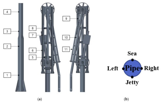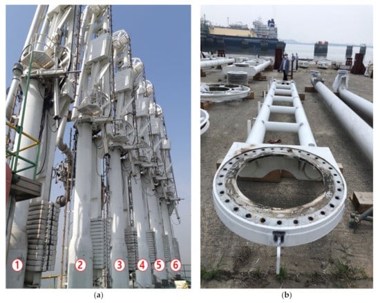 The structure selected for this study was the unloading arm (ULA) system installed in “A” Port 30 years ago. As shown in Table 2, it is a system composed of six marine arms divided into three main types. Here, the LNG (Liquefied Natural Gas), BOG (Boil-off gas), and Bunker unloading arms are denoted by the letters (L), (BOG), and (B/C), respectively. Since this system base was installed on a slab made of steel located about 14.5 m above sea level, it is hardly influenced by sea wave effects. Figure 3a is a picture of the ULAs taken at “A” LNG terminal. When the components are disassembled as in Figure 3b, it is also very convenient to perform non-destructive testing (NDT) to evaluate structural condition. The ULA was operated using a hydraulic system. The main components of this ULA are made of carbon steel, including some basic components such as risers, baseplates, anchor bolts for connection to the ground, inner and outer arm supports, pipelines, and operating systems as shown in Figure 4. Its structural system and pipeline system are isolated from each other. Connected by a swivel joint, the swivel joint is the heart of the ULA and plays an important role during operation. The ULA is designed so that pipelines and swivel joints do not bear the additional load, and the load is very light. All weights and external loads are carried by structural supports. This design allows for easy replacement of deteriorated structural systems and better preservation of pipelines and operating systems, extending the life of the ULA. Only structural systems are evaluated in this study.