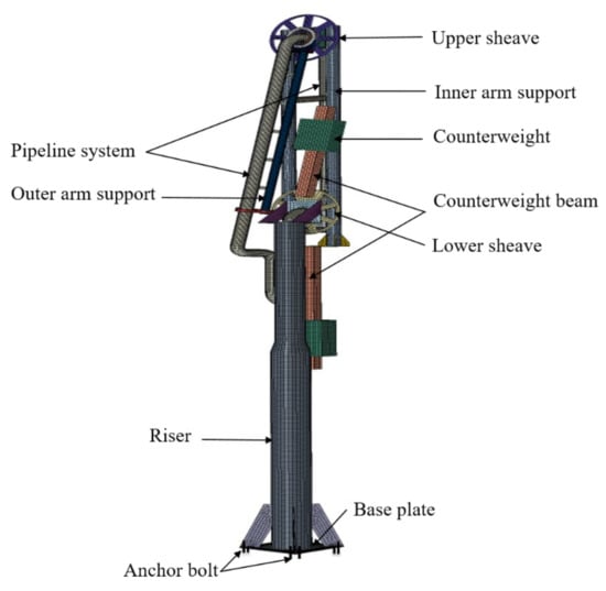 Finite-element model with main components of a typical unloading arm of this study.