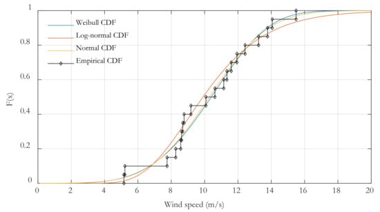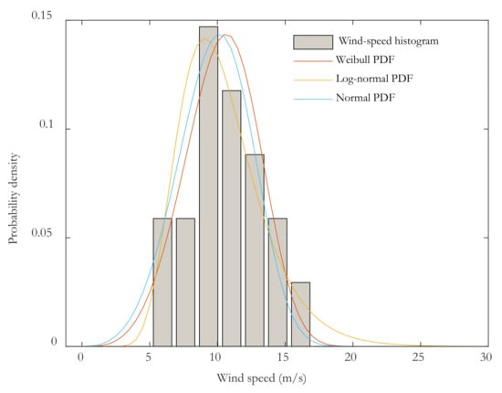 Probability density functions are used to determine the wind potential in a specific area. There are several distributions used in modeling wind speed in the literature as Weibull, Log-normal, and Normal distributions. Given that fitting between the selected model and actual data is a question, several probability density functions should be compared to produce a minimum fitting error. In this study, the wind-speed data were expressed by the Weibull, Log-normal, and Normal distributions. Then, the Kolmogorov–Smirnov (K–S) and chi-square () tests were used to evaluate the performances of these distributions to find out the best fitting tool for the wind-speed data.