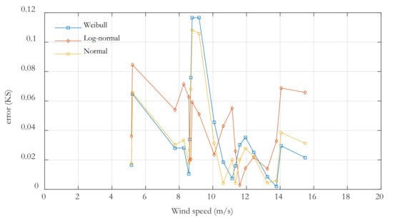 Figure 8 presents CDFs of the three distributions. The difference between the observation and estimation values can be seen clearly. From Figure 8, the error between the empirical CDF and theoretical CDF was obtained and shown in Figure 9. Table 6 includes the K–S test and test values of applied distributions. Bold values indicate the best results. The results reported in Table 6 indicated that, based on the results of the K–S test, log-normal distribution was found to be the best one followed by Weibull and Normal distribution. The Weibull distribution showed better performance compared with others based on the statistics value of the test. In this study, as a conclusion, the Log-normal distribution was chosen for the wind-speed random variable in the reliability analysis because it provides a better modeling in terms of the K–S criteria.