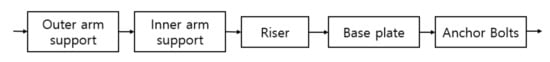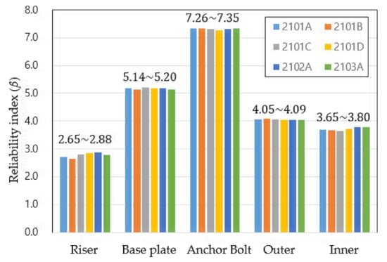 Table 9 and Table 10 are the reliability indices and failure probability results, respectively, for five major structural components, namely, riser, base plate, anchor bolts, and inner and outer arm supports, corresponding to each model of the ULA. Figure 11 summarizes the reliability indices of ULAs classified by components. From Table 9 and Figure 11, it can be seen that the minimum reliability index corresponds to the riser component, which accounts for the damage caused by wind phenomena. Risers with the function of connecting the upper structure to the ground, bearing the entire weight, were particularly vulnerable. For the six ULA models, reliability ranges were 2.465–2.882 for risers, 5.136–5.203 for baseplates, 7.262–7.346 for anchor bolts, 4.049–4.088 for external arm supports, and 3.654 to 3.796 for internal arm supports, respectively. Obviously, the reliability indices depended on the particular component being considered. However, in general, the reliability indices corresponding to each ULA model increase in the order of riser, inner arm support, outer arm support, base plate, and anchor bolt. Anchor bolts have the highest reliability indices followed by the base plate, which implies that these two components are less vulnerable to wind action. This is because these two components are located on the foundation surface, convenient for maintenance and periodic inspection. In the evaluation, the deterioration state of structural components was considered in consideration of inspection data by an NDT, but the anchor bolt and base plate components were not deteriorated due to good maintenance such as early replacement. Their reliability index can here be seen as the original or design reliability index. Comparing the reliability index target with the results in Table 9, it can be concluded that, presently, all structural components are safe since their reliability values are higher than the target reliability index value (2.6). Some evaluations were also similarly given in terms of failure probability. The failure probability of the riser was the highest and the lowest for the anchor bolt component. In general, the failure probabilities of the entire ULA system are low, within the safe range (.