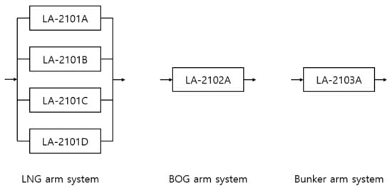 Since this LNG arm system loses its function if all four ULAs in the system fail at the same time, the failure probability of this LNG arm system can be calculated by Equation (8), where is the failure probability of ULA models in the same system (see Table 11). The BOG arm (BOG) and Bunker arm (B/C) systems consist of only one unloading arm, as in Figure 13, so the failure probability of the ULA is the same as the failure probability of systems. The results of failure probability and corresponding reliability index of systems are given in Table 12. It can be seen that the failure probability of the LNG arm system is very low. This can be explained in that four ULA models failing at the same time is extremely rare.