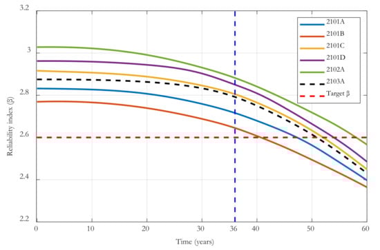 As an example of the application of reliability in practical engineering, in this section, the most vulnerable structural component of each ULA model is analyzed based on the proposed time-dependent reliability analysis process. The riser has been shown to be the most vulnerable component to environmental deterioration and wind action, and it has the lowest reliability index compared with other components, in the range of 2.645–2.882 (see Table 9). Accordingly, the change in the reliability index of the riser over time was investigated, and analysis was performed until the reliability index reached the target reliability index limit (2.6).
