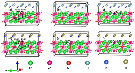 In this work, theoretical insight of quantized conduction in Sr2ZrO4 being 2D RP perovskite material with TiN(TaN) electrode to understand RS in RRAM devices is elucidated. In this regard, first of all, and supercells of tetragonalSr2ZrO4, cubic TiN, and cubic TaN, respectively, were modeled theoretically using the detail of structural parameters given in Table 1. The valence electronic configuration of the constituent particles used in these calculations were Ti = 3d2, 4s2; Ta = 4f14, 5d3, 6s2; N = 2s2, 2p3; Zr = 4s2, 4p6, 4d2, 5s2; Sr = 5s2, and O = 2s2, 2p4. After cleaving the layer of TiN (Ti = 8, N = 8 atoms), TaN (Ta = 8, N = 8 atoms), and Sr2ZrO4 (Sr = 12, Zr = 6 and O = 24 atoms) from these simulated supercell, two hetero-layered structures Sr2ZrO4/TiN and Sr2ZrO4/TaN were optimized (Figure 1) to instigate the conduction mechanism. All of these calculations were carried out using density functional theory (DFT) [44] by employing VASP [36]. Geometry optimization and all first principle calculations of two considered structures were carried out using generalized gradient approximation (GGA). For making calculations more accurate, Hubbard U parameters were used along with GGA to include the coulombic effect along with exchange and non-local exchange correlation functional. All calculations were performed using Perdew–Burke–Ernzerhof (PBE) and projected augmented wave (PAW) potential [45,46,47,48]. The opted value of U parameter for Ti, Ta, and Zr were 8 eV [48], 2.27 eV [49], and 2.66 [50], respectively. Convergence tests for total energy of the system with respect to wave function of electrons were conducted using a plane wave basis having cutoff energy of 510 eV. To relax the system until Hellmann–Feynman force became lower than 0.02 eV/Å was conducted using conjugate gradient method (equilibrium structural parameters given in Table 1). Possible energy criteria of eV [51] was set and most well-known Monkhorst pack sampling technique (MPST) with MP grid was employed here [52,53]. As this study aims to instigate the Vos-based interfacial RS, so Vos at interface of RS layer and electrode layer, O2− atoms were removed from site where Zr-O and N-O bond length (Table 2) was lesser. Electronic properties were instigated using isosurface charge density, integrated charge density (ICD), density of states (DOS), and partial density of states (PDOS) plots. To determine the quantitative analysis of charge redistribution, a Bader charge analysis was also conducted. The work function of the considered composites was also calculated to elaborate the interfacial effects. Formation energy calculations confirmed the stability of studied composites.