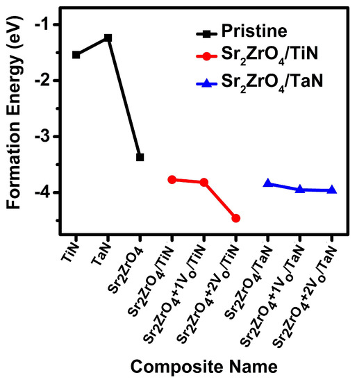 Formation energy is considered an important parameter in deciding the RRAM properties such as stability, forming voltage, endurance, and retention. In this work, formation energy is calculated by introducing single and double Vos in the nearest neighbor layer (L1) of electrode layer to maximize the interfacial effects. Negative values of formation energy (Figure 3) in absence and presence of Vos confirm that considered composites are stable and can be prepared experimentally [54,55]. Change in formation energy of Sr2ZrO4after connecting with the electrode is attributed to the interfacial effects. It is also clear from Figure 3 that changes in formation energy of Sr2ZrO4/TiN after introducing the Vos are not gradual but abrupt and may cause stability issues in attaining required stable RS state. On the other side, small and gradual changes in formation energy of Sr2ZrO4/TaN before and after introducing Vos will assist in attaining the stable RS state and hence in overcoming the uniformity and variability issues caused by random changes. Moreover, it is also expected that smaller formation energy for Sr2ZrO4/TaN will make this system more stable, resulting in slowed down depletion of Vos from the conducting filament. This may also result in slower Vos diffusion rate. These results may assist in attaining stable LRS of RRAM and hence improve the retention properties by making the LRSHRS process robust. However, required forming voltage will become higher due to smaller formation energy and stability of the Sr2ZrO4/TaN. Sr2ZrO4/TiN-based RRAM devices will work with lower forming voltage due to higher formation energy; however with higher formation energy, this system may be unstable and may cause instability issues. Zhong et al. [14] reported the easy escape of oxygen from HfO2 system with TiN electrode in the atmosphere to form O2 molecule. They also reported the use of Ta layer above HfO2 to prohibit this escape and elucidated the movement of O atoms from HfO2 layer towards the interface of Ta/HfO2 and stayed exhibiting stable RS. Fukuchi et al. [56] also reported the formation of rough granular paths formed by Ti metal at interface making the diffusion of anion harder. The whole of this discussion is confirming that nature of electrode influences the formation energy and hence retention properties and forming voltage of Sr2ZrO4 being treated as RP layered perovskite-based RRAM devices.