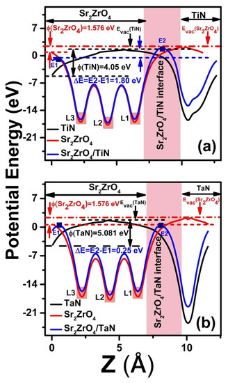 Potential energy lineups of pristine (a) Sr2ZrO4, TiN, Sr2ZrO4/TiN and (b) Sr2ZrO4, TaN and Sr2ZrO4/TaN. Pink highlighted region labelled L1, L2 and L3 as an indicative of three layers formed inside the Sr2ZrO4 layered Ruddleson–Popper perovskite structures.