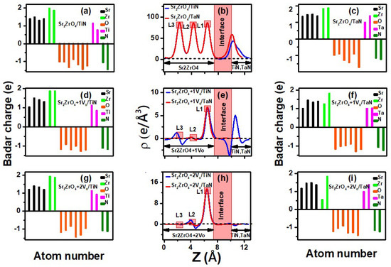 Integrated charge density plots of the considered composites along with respective Bader charge analysis are displayed in Figure 6. Positive values and negative values of integrated charge density explains the variations of positive and negative electron density along z-axis as displayed in Figure 6. Three distinct peaks as shown by highlighted regions in Figure 6b with positive values are indicative of charge accumulated and hence quantized conduction in the three layers (L1, L2, and L3) of Sr2ZrO4. Whereas, at interface of RS material and electrode (6.8 Ǻ–10 Ǻ), charge redistribution is observed near electrode (as shown by highlighted region in Figure 6b). Thedominating integrated charge redistribution peak is indicating the better oxygen scavenging capability of TaN electrode as ascribed in potential energy lineups and isosurface charge density plots. The respective Bader charge analysis as shown in Figure 6a,c also confirmed charge accumulated by “O” and “N” atoms with negative Bader charge value and depleted by Sr, Zr, Ti, and Ta atoms. The negative (positive) Bader charge value is verdict of anionic (cationic) nature of “N” and “O” (Zr, Sr, Ti, and Ta) atoms. This can be seen in the form of charge accumulated around “N” atoms of both electrodes and “O” atoms of RS material present near the interface forming interfacial TiON(TaON) layer in isosurface charge density plots (Figure 5a,c). By creating single Voin Sr2ZrO4 layer near the interface as shown in Figure 6e, the conductivity of the L2 and L3 reduced and charge became localized near the Vo in the vicinity of RS layer-electrode interface in L1 with single dominating positive peak. The reduced peak value of integrated charge density plot confirmed the reduced conductivity of the whole system. With 2Vos, interfacial conductivity increased again and interfacial layer L1 localized the maximum charge after extracting from L2, L3, and TiN (TaN) electrode as elucidated with only positive peak as shown in Figure 6h. It is also clear that among the two considered systems, TaN localized more charge by reducing the conductivity of bulk layers L2 and L3 and participated more actively in achieving the desired quantizing conduction. Evidently, TaN is more effective in increasing the interfacial conductivity and hence reducing the contact resistance. It is also clear from IC plot in Figure 6e,h that CFs formed by Vos in isosurface charge density plots (Figure 5) are of the order of few angstroms i.e., nano-scale to atomic unit and hence quantized conduction. On the basis of results reported on quantized conduction in refs. [19,20], area of considered devices can be scaled down up to nanometers to achieve remarkable RS performance by overcoming reliability and variability issues. Bader charge analysis in the respective figures again showed the above demonstrated behavior with slight changes involved in just Bader charge values attained by each atom.