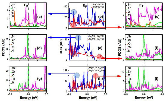 Detailed insight of electronic properties in terms of DOS (middle panel) and their respective PDOS (specified by highlighted circle and arrow in left and right panel) spectra is presented in Figure 7. In these plots, FL is indicated by a black dashed line and left and right region of FL are VB and conduction band (CB), respectively. It is indicated from Figure 7b that both pristine systems are conductive in nature with nonzero localized defect states present near and around the FL. Reasoning of each localized state in VB and CB of DOS is the verdict from elemental behavior of individual atom in PDOS. It is justified from PDOS spectra that “O” atom of RP layered RS composite and N and Ti(Ta) atom of TiN (TaN) electrode are playing comparatively more dominating role. This resulting in strong overlapping of orbitals and hence resulted in TiON (TaON) layer observed in isosurface charge density plots (Figure 5). Whereas localized states in PDOS of Zr atom are pointing towards its tendency to change its valence state as a result of oxidation occurring at interface. Work function, ICD plots, and Bader charge analysis also confirmed this conducting behavior of composites at interface. On creating the single Vo in RP-layered RS composite, conductivity of the considered composite decreased in both cases with lesser localized states in VB as well as CB of respective DOS plot (Figure 7e). Whereas conductivity increased again by increasing concentration of Vos (2Vos here) with again increased localized state in DOS plots (Figure 7h). It is also indicated from the PDOS of the two later cases that presence of Vos effected the local conductivity of considered systems and localized states of Zr (nearest neighbor of Vos) and Ti(Ta)atom became more dominating than any other constituent of the considered composites in Figure 7 within the energy −0.5–0.5 eV around the FL. This also confirmed the important role of Vos based conductance quantization in localizing the states of Zr and Ti(Ta) atoms near the FL in VB and CB, respectively. This also confirmed the fact that the Zr4+ atom tended to change its valence state to Zr2+ to maintain the neutrality and hence stability of the system in the presence of Vos. These results confirmed the stability of LRS and HRS attained in system.