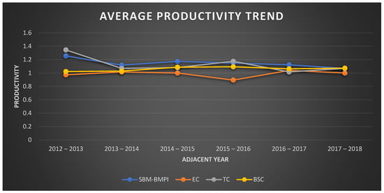 Note that SBM-BMPI, TC, and EC greater than unity means a productivity improvement; when these values less than unity, a recession is denoted, and values equal to unity denote stagnation in productivity.