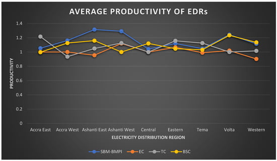 The results of static productivity for each EDR are presented in Table 2 below. Figure 1 shows the productivity dynamic productivity of all EDRs together with the decomposed productivity changes namely: average EC, TC and BSC of EDRs for adjacent periods. Additionally, the average SBM-BMPI, EC, TC and BSC of each EDR for the study period are presented in Figure 2. The figures and table in this paper are the authors’ work. The productivity scores were obtained using the MaxDEA 7 Ultra software.