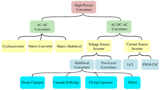 In the field of high power (>1 MVA) and medium voltage (>2.2 kV) converters for motor drives, several researchers have made significant efforts to search for new topologies of converters, or solving technical problems and optimizing the performance of existing topologies for specific applications [2,3,4,5]. During the last decade, high-power semiconductor technology has improved, and several studies have focused on optimizing existing topologies and their variants. Currently, the most common structures for high-power applications are AC–DC–AC topologies with input diode or active rectifiers and output voltage source inverters (VSI) [6] (Figure 1). In some applications, current source converters (CSC) have also found a place in [7] industry. In addition to conventional converters that are relatively mature, some alternative topologies, including various types of hybrid multilevel converters [8,9,10], active clamping diodes (active neutral point clamped—ANPC) [11,12], modular multilevel converters (MMC) [13,14], and multilevel matrix converters [15,16] have also attracted interest in recent years. While the overall effectiveness and benefits of these emerging topologies still need further investigation, some of them have already proven to be commercially attractive. Correspondingly, modulation and control strategies adapted to these new converters have been proposed and studied in a large number of recent publications, contributing to improve operational performance, as well as to explore new possibilities.