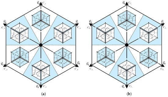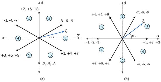 Vectors grouped in the Alpha–Beta plane. (a) Input current. (b) Output voltage.