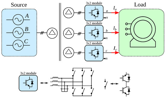 The modulation used here for the MMMC is indirect SVM. The modulation considers a virtual DC link between the rectifier and inverter parts. The indirect model of the MMMC with three modules, one per phase, shown in Figure 7 is used as a basis for the study of modulation [27].