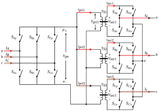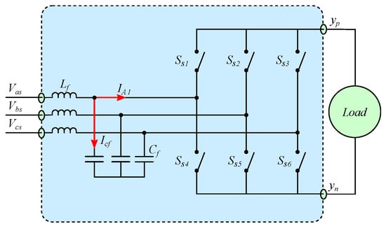 Figure 6 shows the MC module used in the MMMC. Under normal operating conditions, the switches can be turned on or off, the output terminals and can be connected to any of the three input phases a, b, and c depending on the desired voltage level. In the input part, the MC module is connected to the secondary winding of a transformer (, , and ). The input filter is used to filter the harmonics generated by switching. The load must be inductive, as the converter needs a constant flow of current to produce a sinusoidal current waveform at the input.