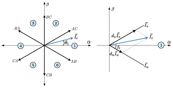 where represents the modulation index of the rectifier, which is normally used as 1, since the magnitude of the input current depends on the load. is the angle of the reference sector .