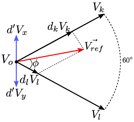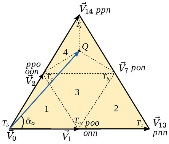In the case of three-level SVM, the reference vector is synthesized by three closest stationary vectors, generating a superior harmonic quality. To demonstrate the relationship between time and , Figure 10 is used as a base. Assuming that the tip of the vector is exactly at the center of the triangle of region 4, at point Q, the vectors have the same size as their origin up to the point Q. This can be verified by substituting and in the equations of Table 1 in [63], resulting in . If you move towards the vector , it means that the vector has a stronger influence on , which results in a longer application time of the vector . When is identical to , the time representing the vector has the maximum value (), while the times and of the vectors and have their value decreased to zero [63].