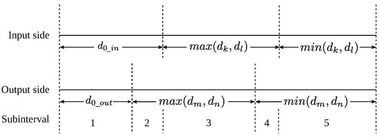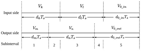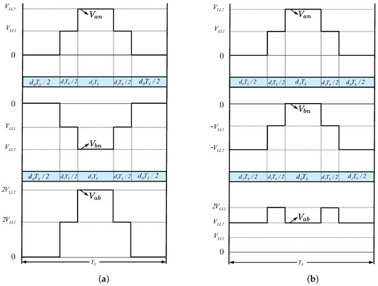 Figure 11 illustrate two different switching sequences that are exemplified by the phases a and b. To distinguish the difference between them, we consider in a particular period, in which it takes on the value zero, while is positive and is negative. With these conditions, the duty cycles for the phase a and b are the same. In the figures, and denote two magnitudes corresponding to two input line voltages over the DC bus. , and represent the final value derived for the duty cycles presented in [27]. In this exemplified case, is greater than .
