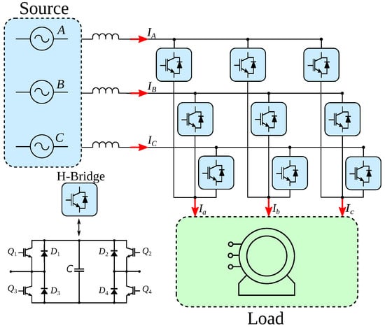 This family of matrix converters can process high power and voltage levels with existing semiconductors. Currently, research on these topologies has advanced and there is a large number of publications, including several multilevel converter topologies, such as the clamping diode converter (NPC) [21], the converter with floating capacitor (FLC) [22], and with full bridge cells (Cascaded H-Bridge—CHB) [23]. These topologies are combined with the concept of the matrix converter, generating the multilevel matrix NPC [24], FLC [25], and multilevel CHB [26] converters.