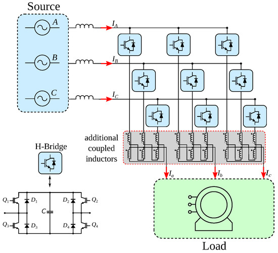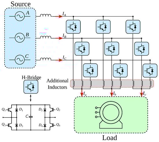 The most cited multilevel matrix structure in the literature is the topology proposed by Erickson in [28], called multilevel modular matrix converter (M3C). Its structure is similar to the CMC, but with characteristics of multilevel converters and without the multi-pulse transformer used in the MMMC structure. In addition, the M3C has features, such as current-fed input and output, simplified control compared to the MMC topology and can work as a step-up or step-down converter, which makes it a preferred candidate for many studies into machine drives. However, its structure is complex compared to conventional multilevel converters and, for this reason, several researchers propose small changes in the topology to improve the general control of the converter. Among them is the addition of inductors in each H-bridge module, which facilitates the balance of capacitor voltages, reduces the chance of destructive short circuits due to failure in command pulses, and makes the control similar to the conventional MMC [29,30]. Another problem found in this topology is its operation at very low frequencies or in conditions where the input and output frequencies are close to each other [31]. Balancing the capacitor voltages becomes extremely difficult at these two operating points [32,33].