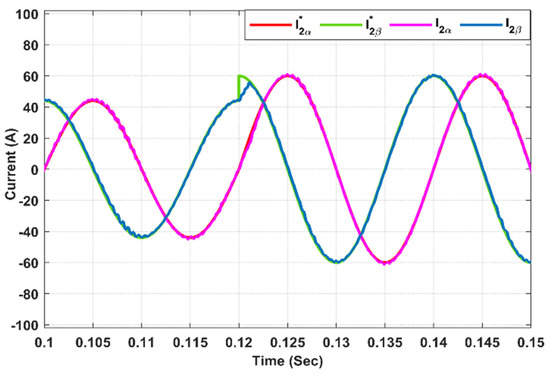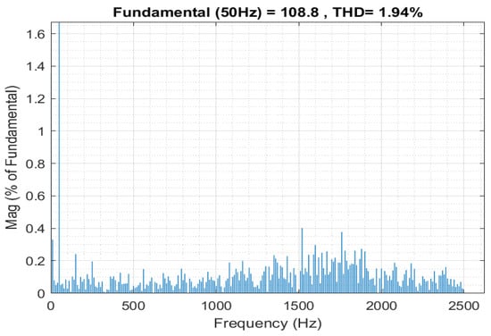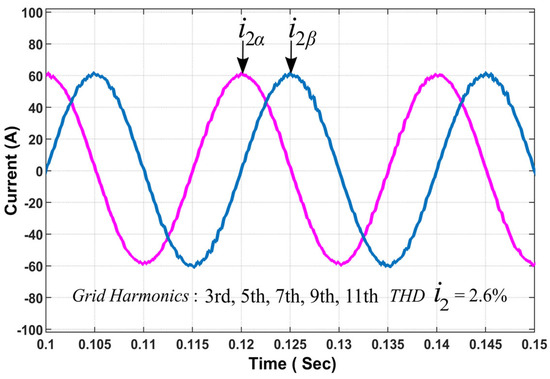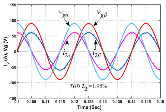 The proposed control scheme presented in Section 3 is implemented using MATLAB and Simulink platform in the α, β reference frame. In addition, the ST-ISMC controller performance is analyzed for filter parametric variations, grid inductance change, reference tracking, and utility grid harmonic components. In this study, a phase-locked loop is used to measure the grid voltage angle. The measured voltage angle is utilized to generate the sine wave at an angle similar to the grid voltage. This reference signal is subtracted from the grid current signal measured using the current sensor. The error signal is then fed to the ST-ISMC controller for reducing the steady state error and maintaining the system stability. Figure 4 shows that current delivered into the utility grid is in phase with the utility grid voltage, which ensures the maximum transfer of power. Furthermore, the fast Fourier transform (FFT) analysis of the grid current waveform is presented in Figure 5, which shows that a high-quality current is being injected into the grid. Next, ST-ISMC controller performance is analyzed for various scenarios; first, the controller behavior is mainly analyzed for grid harmonic components. The harmonic voltages are selected according to the European standard EN 50160. The 3rd, 5th, 7th, 9th, and 11th harmonic voltages are 5, 6, 5, 1.5 and 3.5 percent of the main harmonic component. The current waveform under grid voltage harmonics is depicted in Figure 6. Next, the reference tracking performance is examined with a step input change; Figure 7 depicts that the actual current tracks the reference current waveform within one cycle, which exhibits that the controller shows extraordinary transient performance and fast dynamic response.